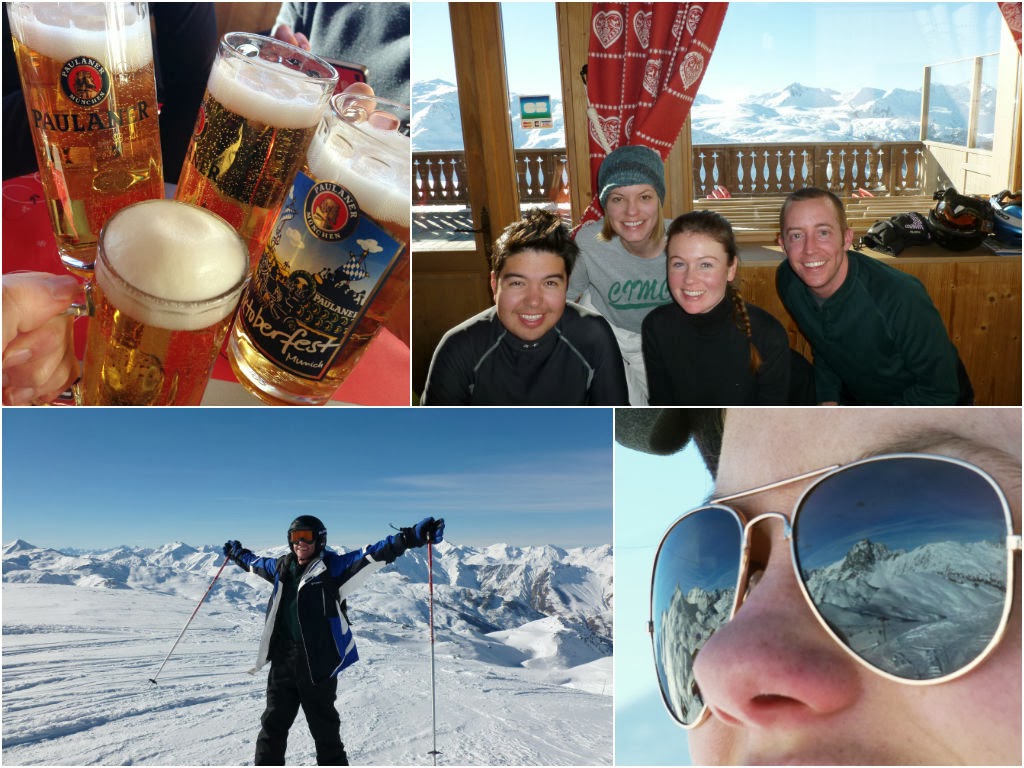 Saturday: We woke to crystal blue skies, sun, and the stunning beauty of the mountains in full sight. We knew this was going to be our best day for skiing, so bright and early we took a gondola up the mountain. The views on the way up and at the top were stunning. We got our first glimpse at Mont Blanc (although I didn't realize what is was until later), and skied down into the town of Val Thorens.